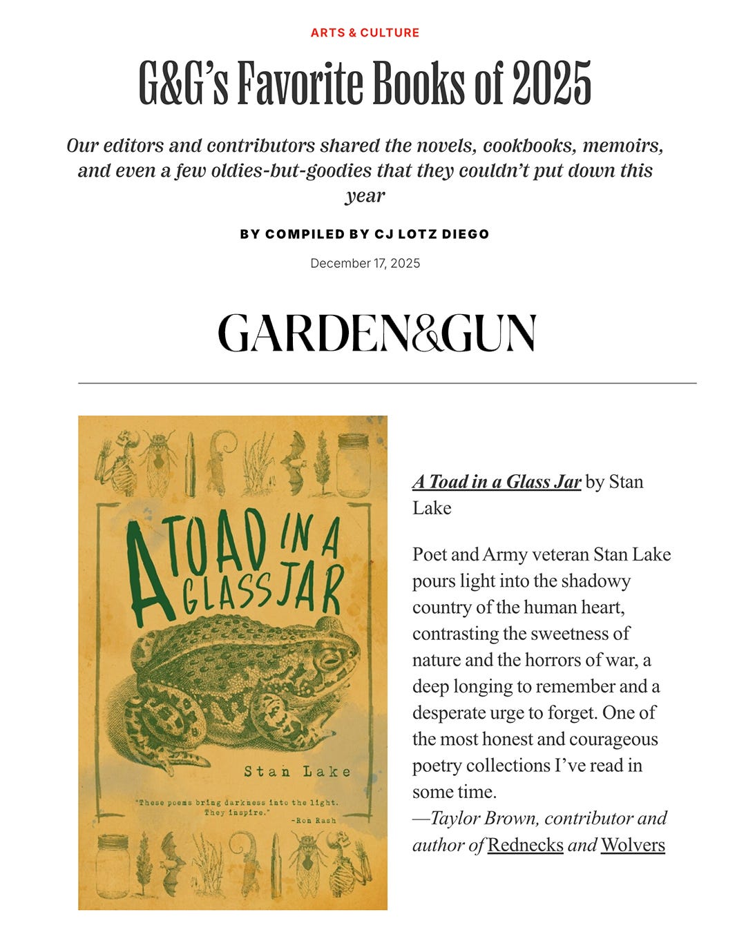 Lastly, I was honored to find out that my book “A Toad in a Glass Jar” was selected as a part of Garden and Gun Magazine’s “Favorite Books of 2025” and to say I was blown away would be an understatement. What a wild year it’s been! Thanks for being a part of it.